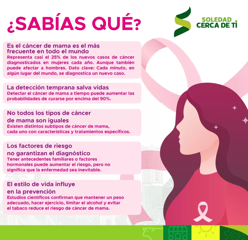 Soledad de Graciano Sánchez, SLP.- Como parte de las jornadas preventivas en el marco del Día Internacional de la lucha Contra el Cáncer de Mama, este 19 de octubre, el Ayuntamiento de de Soledad de Graciano Sánchez, encabezado por el Alcalde Juan Manuel Navarro Muñiz, brindó un espacio de reflexión y sensibilización para fortalecer la cultura del autocuidado con el Foro Rosa: “Con una mano en el corazón y otra en tu conciencia”, donde se brindó información y orientación sobre la prevención, detección temprana y atención del cáncer de mama a mujeres soledenses.