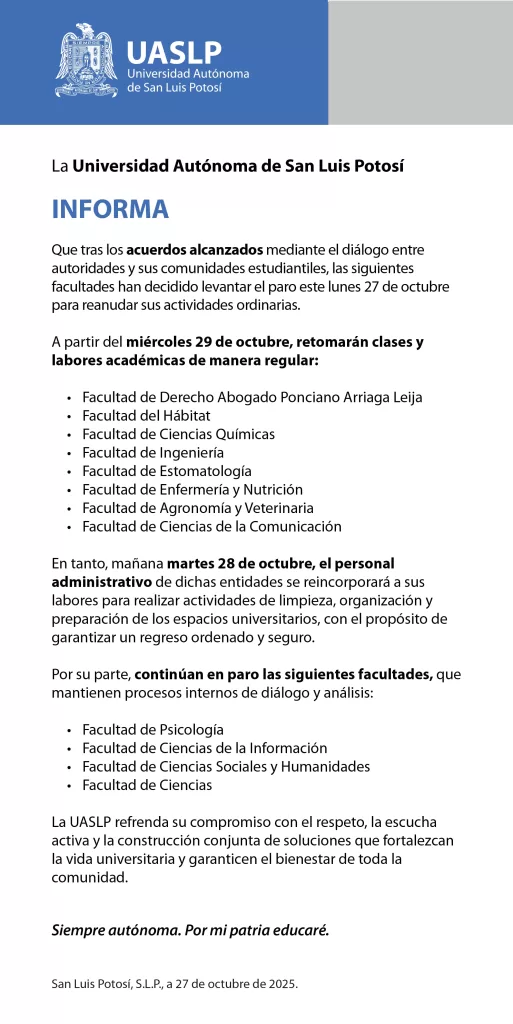 La Universidad Autónoma San Luis Potosí (UASLP) informa a su comunidad y a la sociedad potosina, que tras el periodo de interrupción de actividades por el paro estudiantil y gracias al establecimiento de acuerdos satisfactorios entre las partes, se ha determinado la reactivación de actividades académicas a partir de este día lunes 27 de octubre en: la Facultad de Contaduría y Administración, la Facultad de Economía, la Facultad de Medicina y la Facultad de Estudios Profesionales Zona Media.