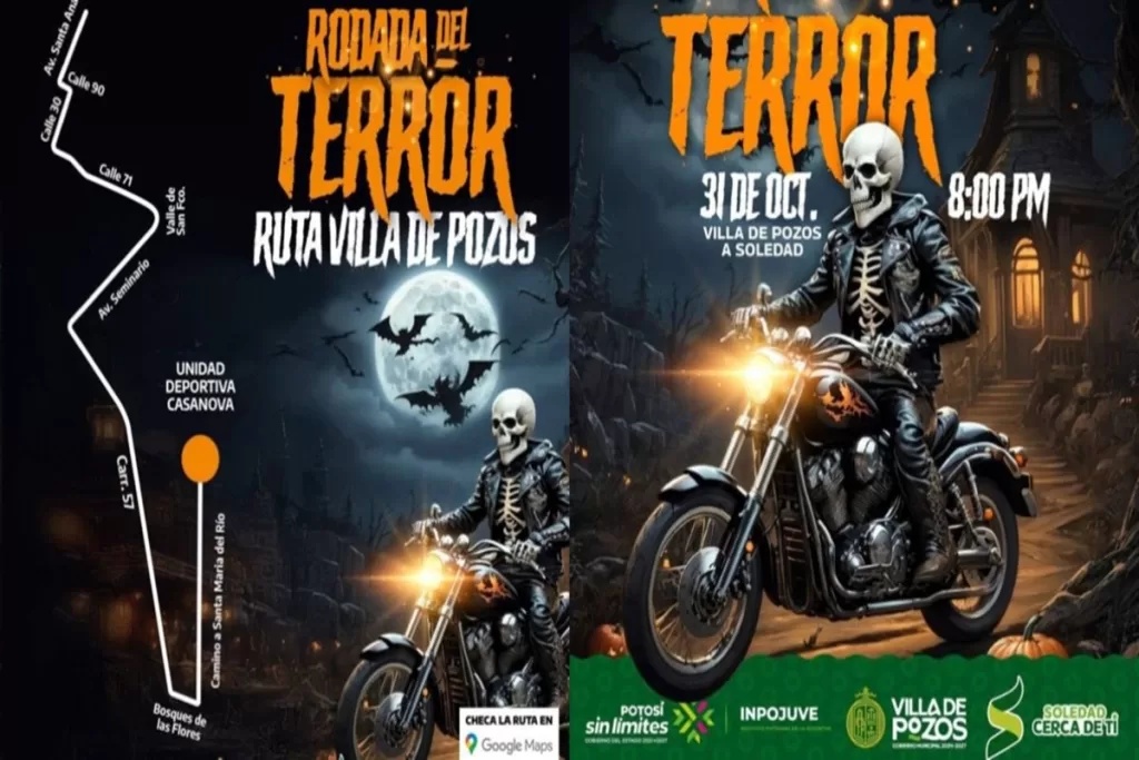 Villa de Pozos, SLP. – El Instituto Municipal de la Juventud de Villa de Pozos, en coordinación con el Instituto Potosino de la Juventud (INPOJUVE) y el municipio de Soledad de Graciano Sánchez, llevará a cabo la “Rodada del Terror 2025”, que se realizará el próximo 31 de octubre a las 20:00 horas, con punto de reunión la Unidad Casanova en Villa de Pozos, donde se espera la participación de más de 4 mil motociclistas.
